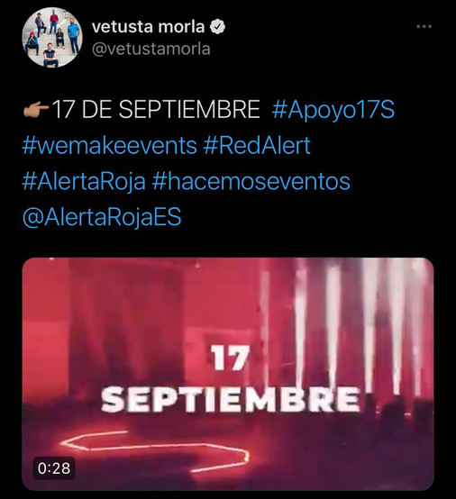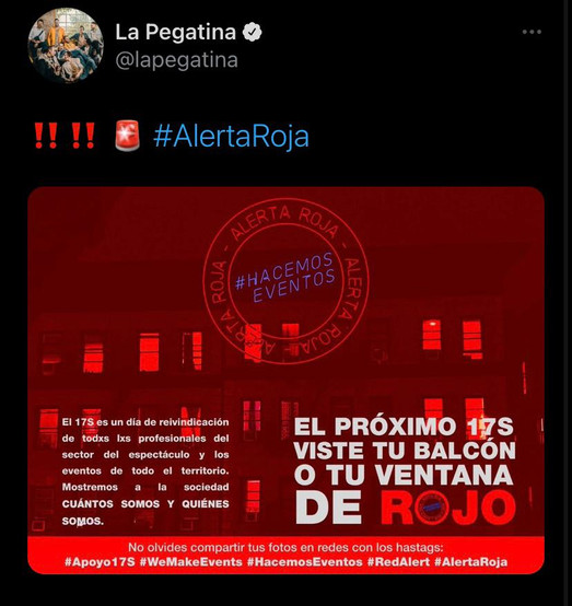 El descontento de los artistas cada vez era mayor, y se dejó en claro con campañas como #AlertaRoja, en la que miles de artistas del país se unían para reivindicar la importancia de la cultura, con slogans como “Sin cultura no hay futuro”. Esta campaña se llevó a cabo en septiembre del pasado año, convocando el día 17 manifestaciones simultáneas por toda España.